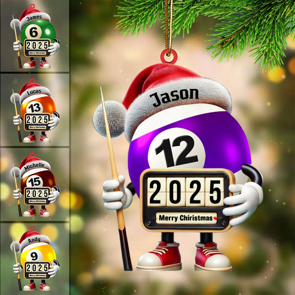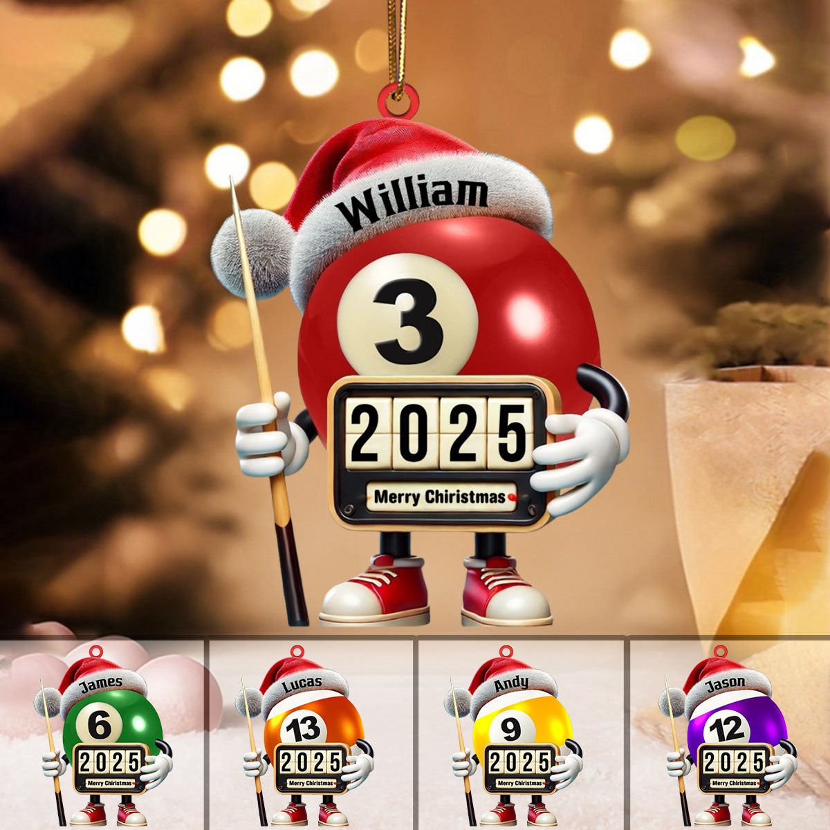 🎱Crafted with precision and attention to detail, this elegant ornament features a classic billiard ball design, customized with a special name or word that speaks directly to the heart of every billiard enthusiast. Made from high-quality, glossy materials, it captures the sleek look and feel of a real billiard ball—perfect as a standout holiday decoration or a year-round display piece.
